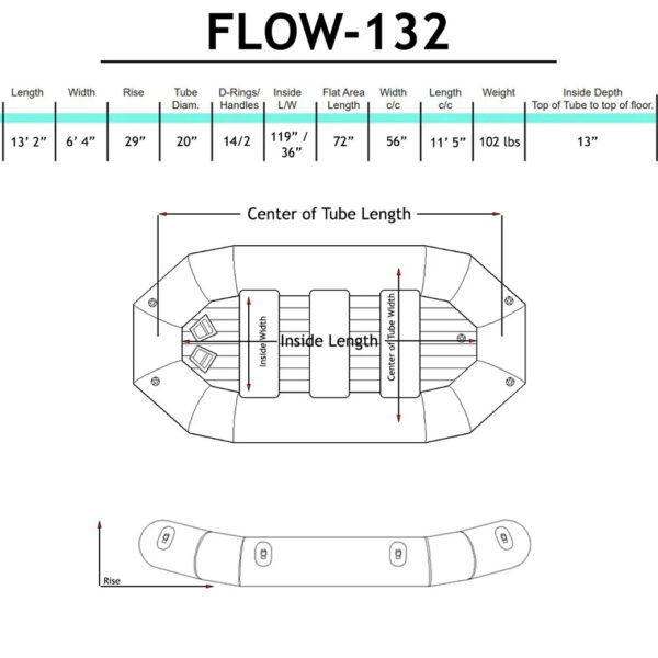 At 13’2″ long, and 6’4″ wide, it is a bit longer and wider than our signature 13′ raft. This new design, coupled with the difference in material, yields a totally different boat that meets the needs of both families looking to float and fish, and whitewater folks looking for a fast and sporty, yet, stable and responsive craft.