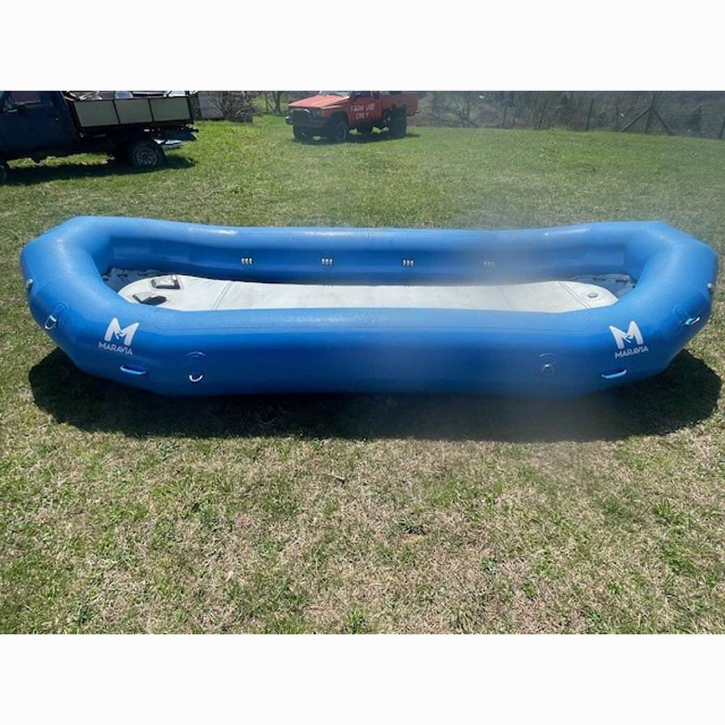 The sleek Maravia Zephyr is a larger version of the Diablo, or a diminishing tube version of the Williwaw 1.5.The tubes diminish in diameter from 21″ in the straight side sections down to 16″ in the bow and stern. This design provides more inside space for gear and people in the bow and stern, and is also an advantage when you encounter those upstream canyon winds in the afternoon.