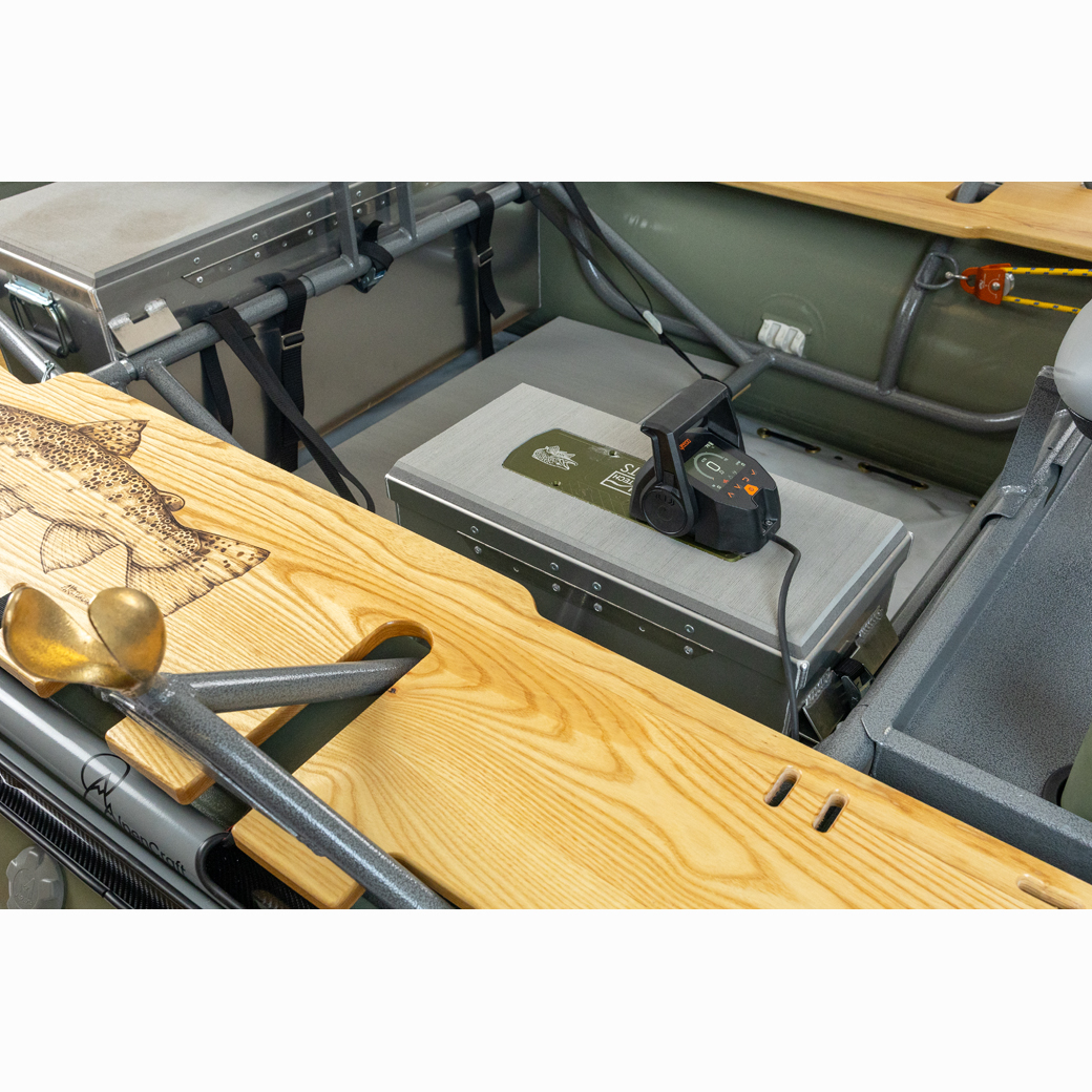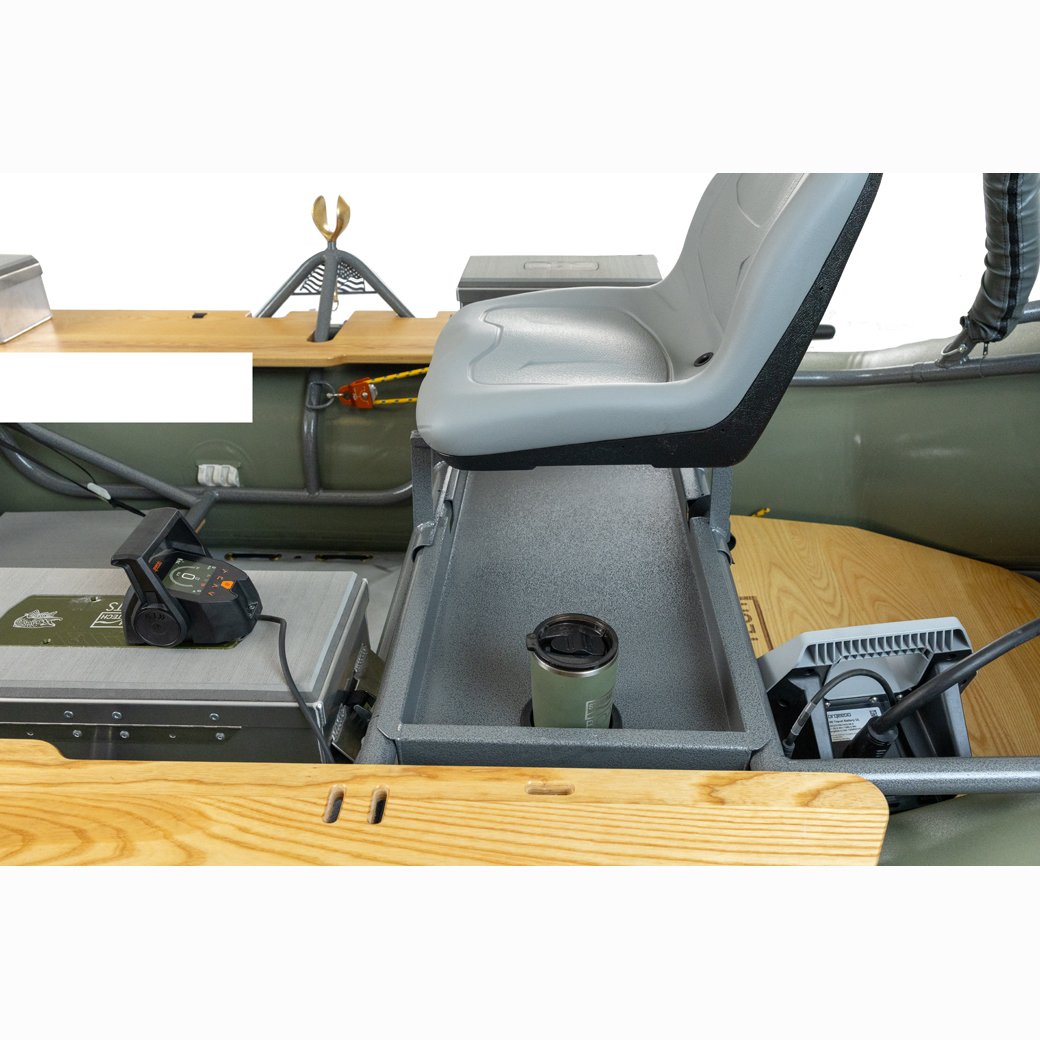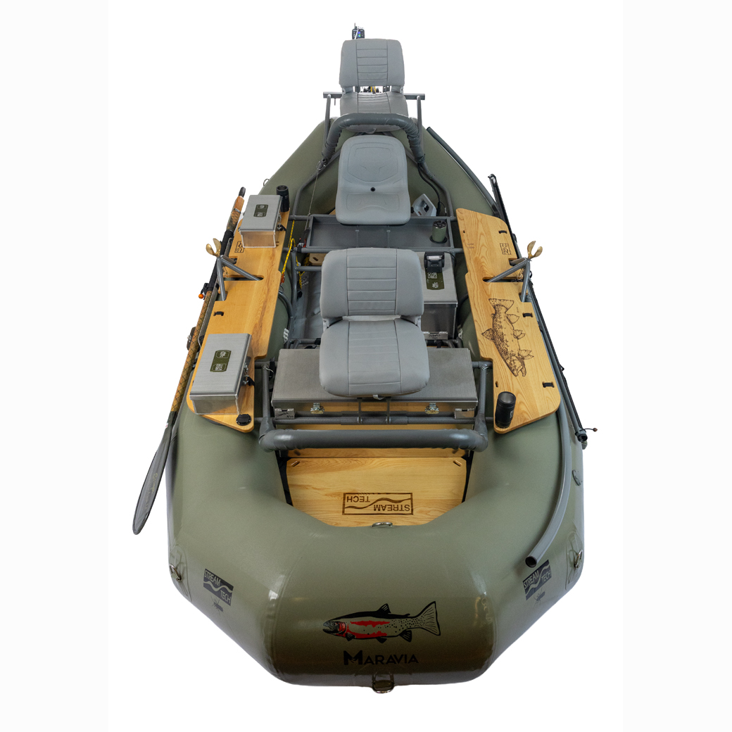 The Salmonfly is the best maneuvering drift boat on the market with a stable high floating design. Key features include a self-bailing, hard, flat “drop stitch” floor, with full length rocker, padded swivel seats and front and rear fishing positions, padded tractor seat and bracket for the oarsman, the Stream Tech anchor system, front and rear fisherman leaning stations, Sawyer Square Top oars, Cobra oarlocks, straps, hardware, pump and repair kit. 3 Gear Bay Frame capacity for boxes or coolers. Raft is built in the USA by Maravia using their tough, unique seamless urethane encapsulation technology. It is the perfect “quiver of one” boat that offers all the best fishing amenities, 3 bay expedition capable frame, tons of possible accessories and thwart option for extreme paddle rafting.
