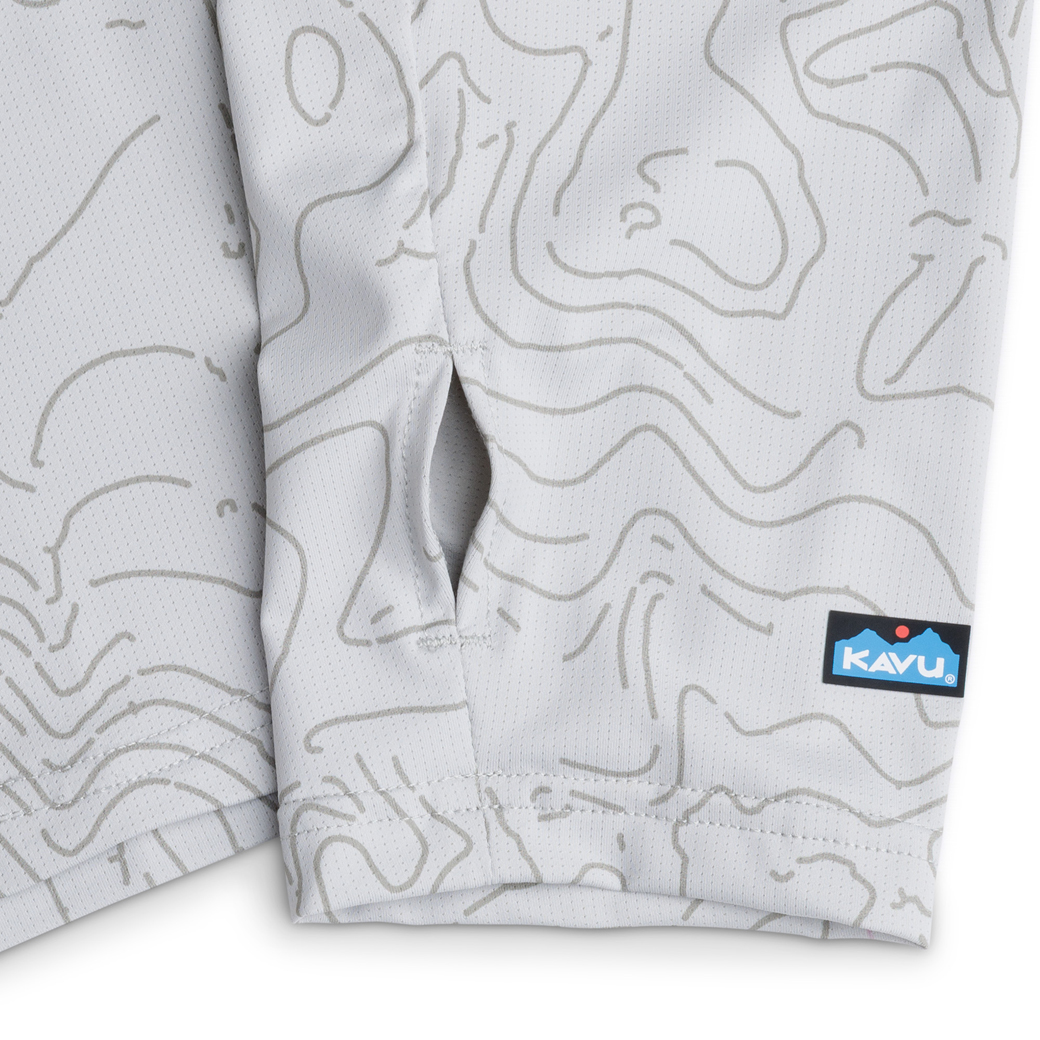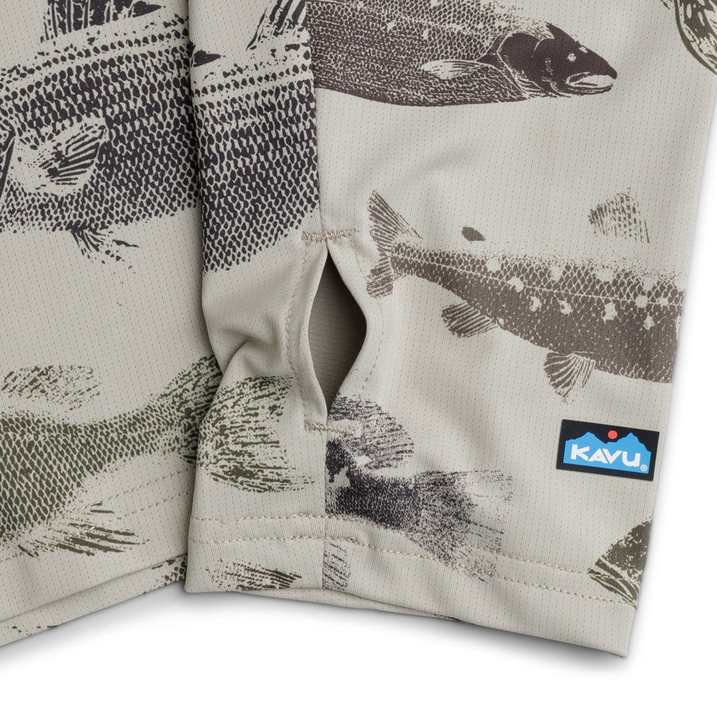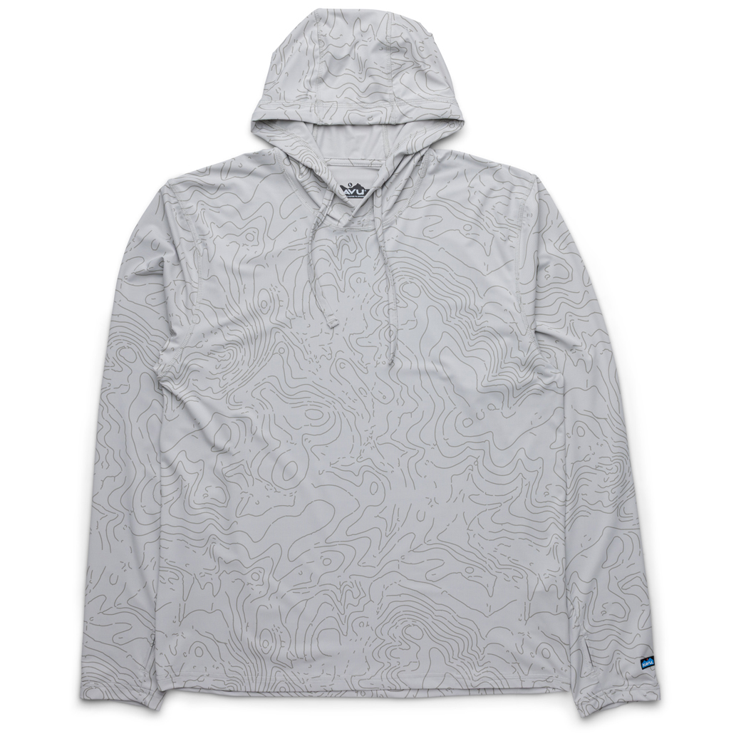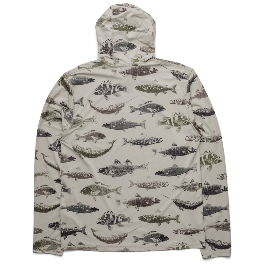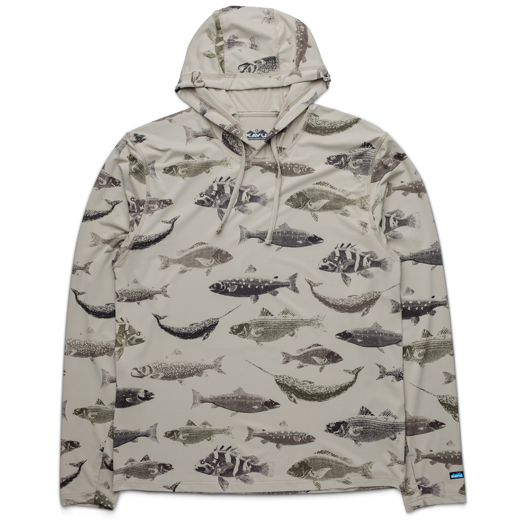 Casual fit, long sleeve hooded sun shirt with self fabric drawcord, all over digital print or screen print on front / back depending colorway, on seam thumb hole, straight hem, 4 needle flatlock stitch seams, high density heat transfer logo label on sleeve and back neck label.