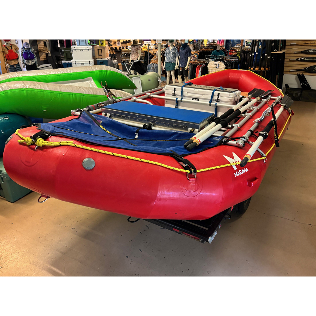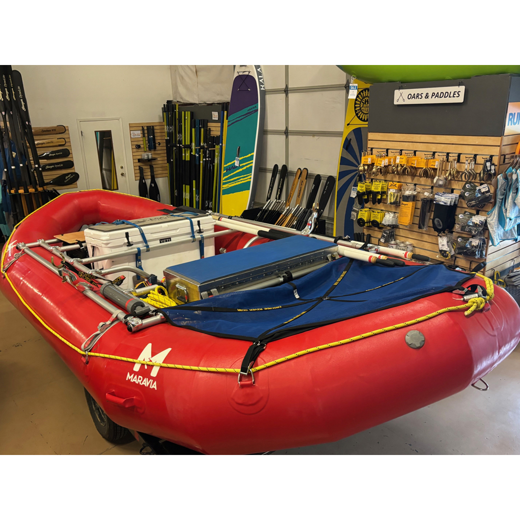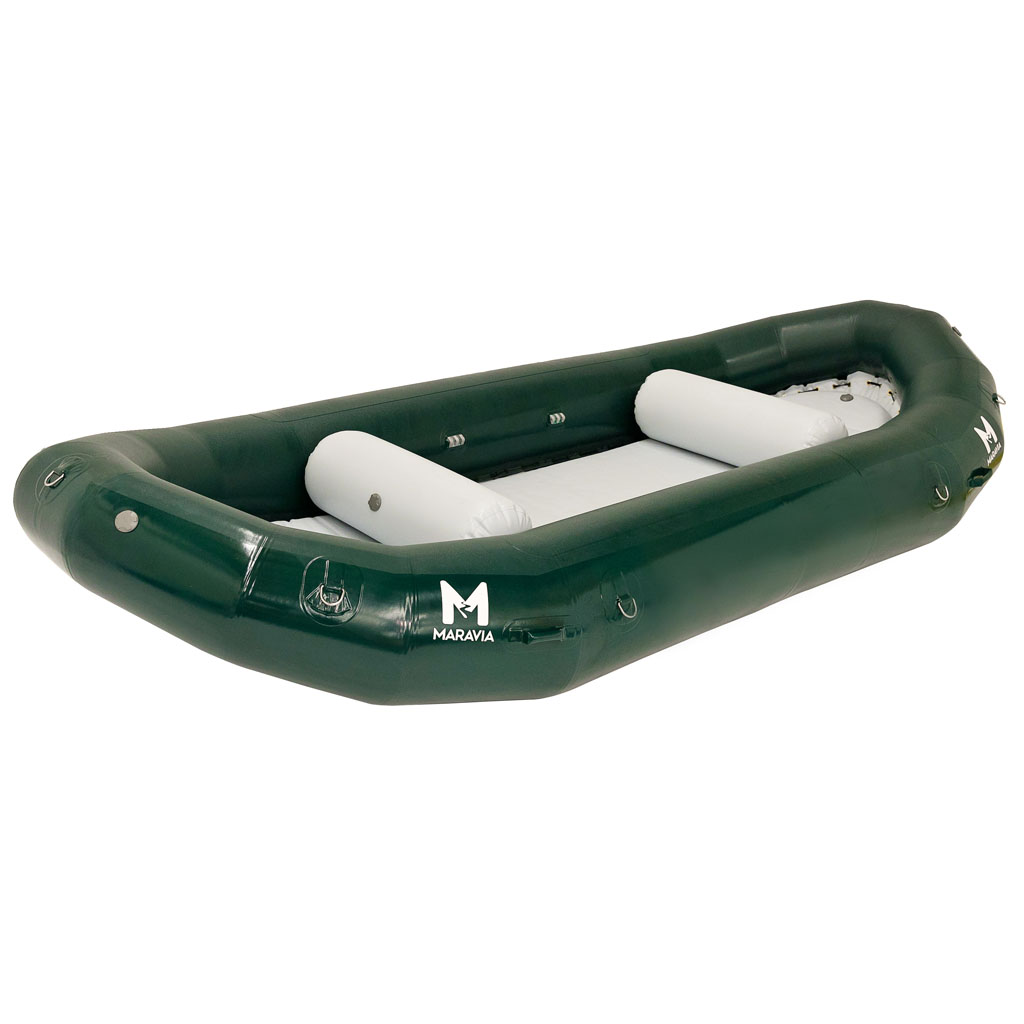 The Typhoon has reduced tube size in bow and stern to add extra room for people and gear. You will appreciate the reduced wind resistance of the smaller tubes on those long calm stretches with afternoon upstream winds. The Typhoon, sized between a Williwaw 2 and Mistral, is 16’ long, 7’ 6″ wide, with 22″ tubes diminishing to 16 inches. Install up to 4 thwarts get your paddle crew and hit the water.